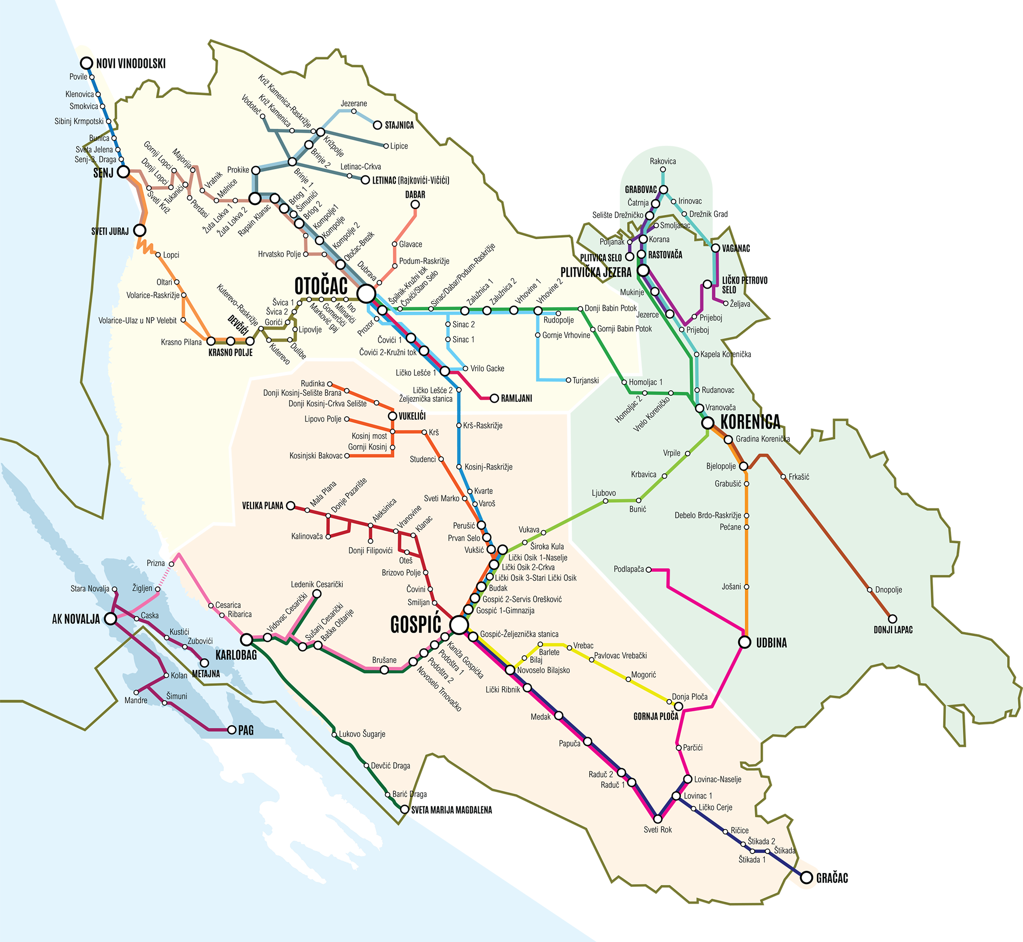 Javna usluga obuhvaća 23 linije od kojih su neke prvi put uspostavljene kako bi se povezala cijela Ličko-senjska županija, a odvija se u četiri zone prometovanja prema kojima je formiran tarifni sustav.